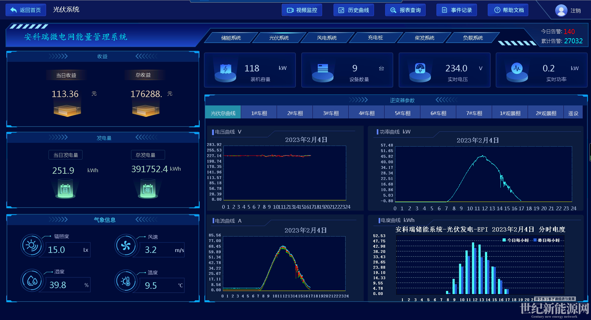 本界面用來展示對光伏系統信息,主要包括逆變器直流側、交流側運行狀態監測及報警、逆變器及電站發電量統計及分析、并網柜電力監測及發電量統計、電站發電量年有效利用小時數統計、發電收益統計、碳減排統計、輻照度/風力/環境溫濕度監測、發電功率模擬及效率分析;同時對系統的總功率、電壓電流及各個逆變器的運行數據進行展示。