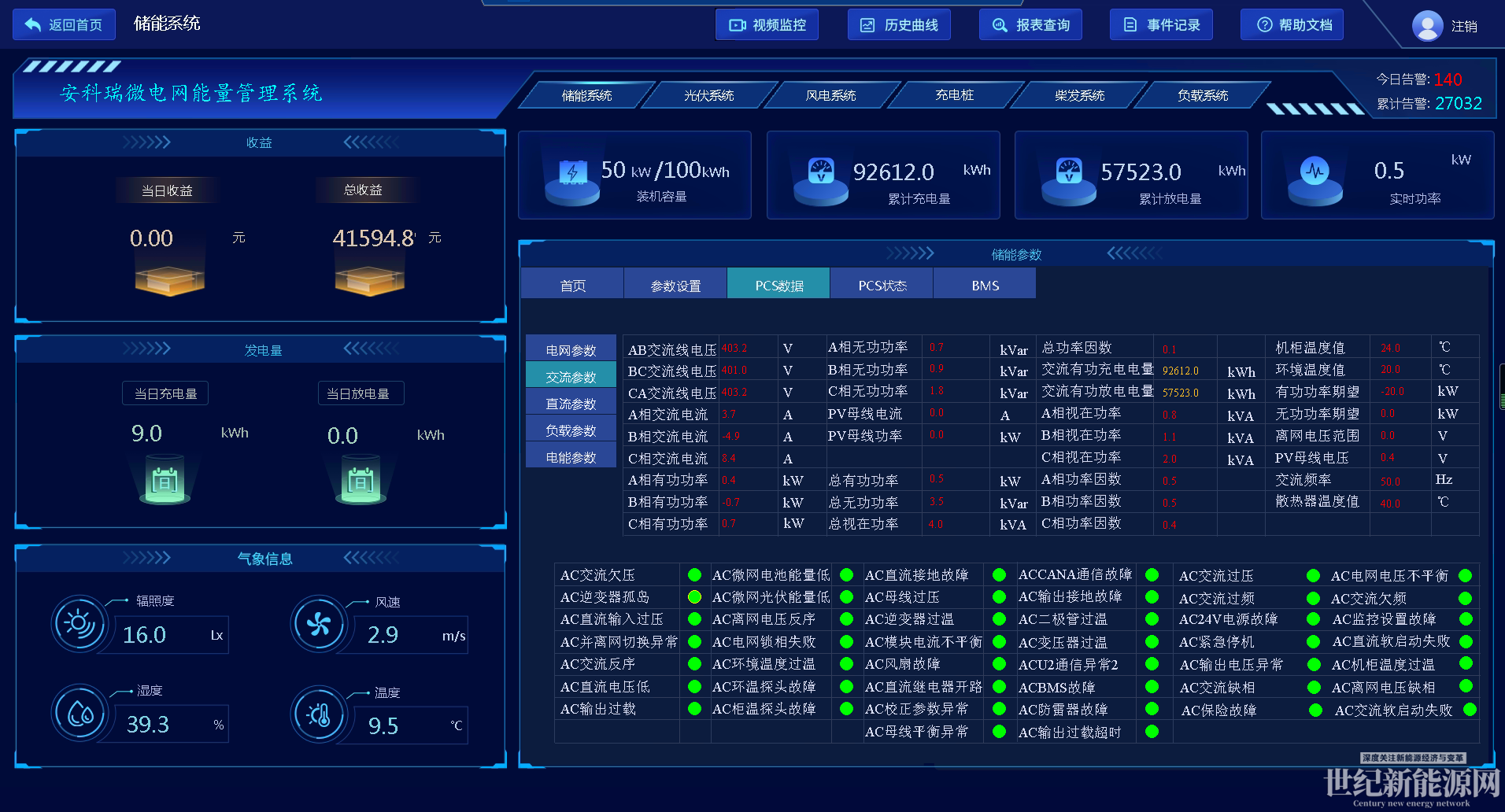 本界面用來展示對PCS交流側數據,主要包括相電壓、電流、功率、頻率、功率因數、溫度值等。同時針對交流側的異常信息進行告警。